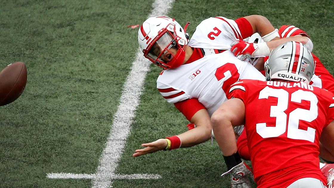 Nebraska quarterback Adrian Martinez (2) loses the ball in the third quarter on Oct. 24 against Ohio State in Columbus, Ohio. The Buckeyes recovered the fumble and returned it 55 yards for a touchdown.