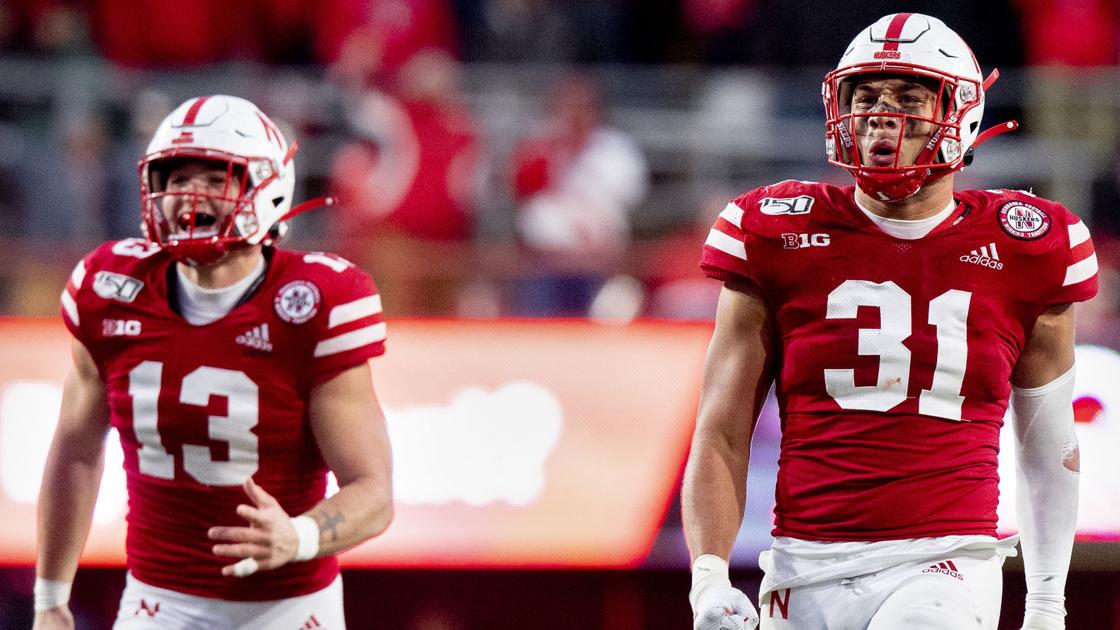 Nebraska's JoJo Domann (left) and Nebraska's Collin Miller celebrate after Cam Taylor-Britt recovered an Iowa fumble late in the fourth quarter on Nov. 29, 2019, at Memorial Stadium.