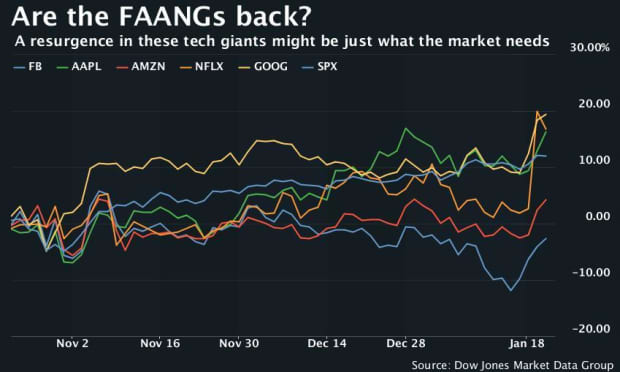 Those “highflying FAANG stocks” haven’t exactly lived up to their billing in recent months, but the longtime leaders of the relentless bull market did help the S&P 500 index SPX, +0.03% break into record territory on Inauguration Day.